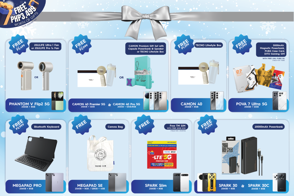 Get the Christmas freebies from TECNO when you purchase from today until Dec. 31, 2025.